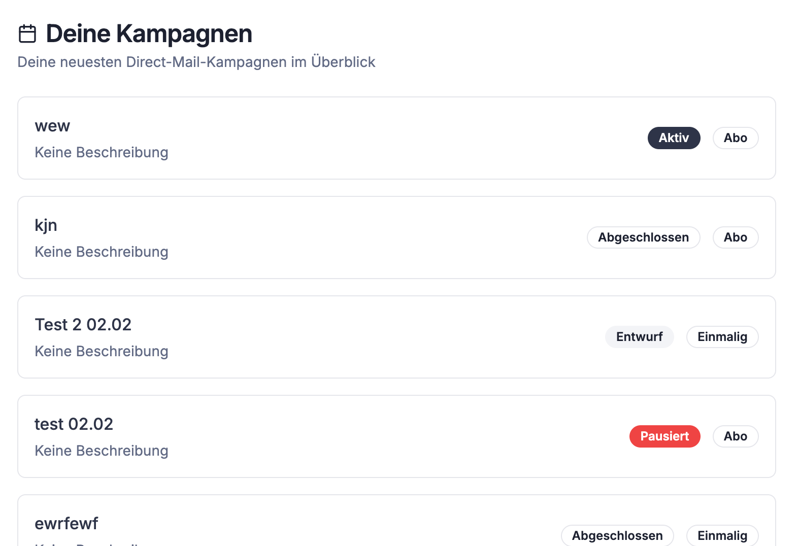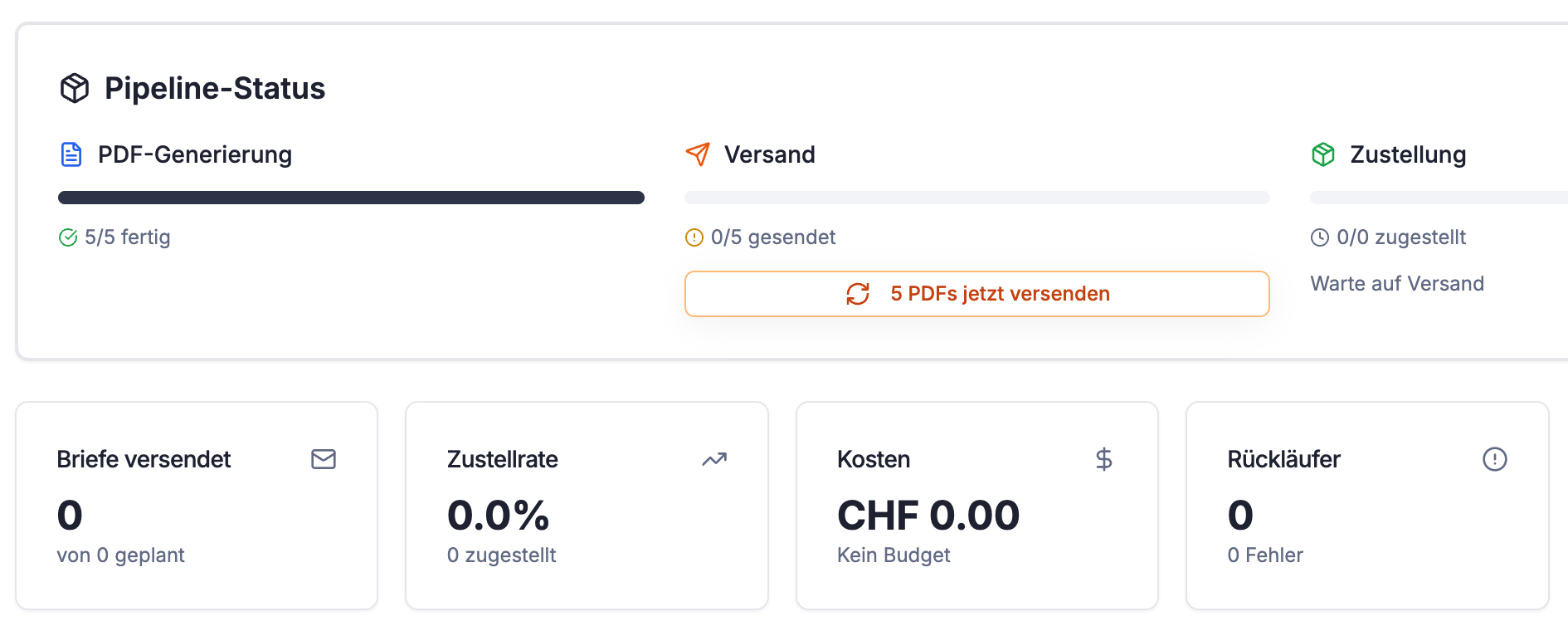 Erstellen Sie personalisierte Direct-Mail-Kampagnen direkt im Tool. Firmenname, Ort oder Gründungsdatum werden automatisch eingefügt – perfekt für Direktmarketing Schweiz mit hoher Aufmerksamkeit.
